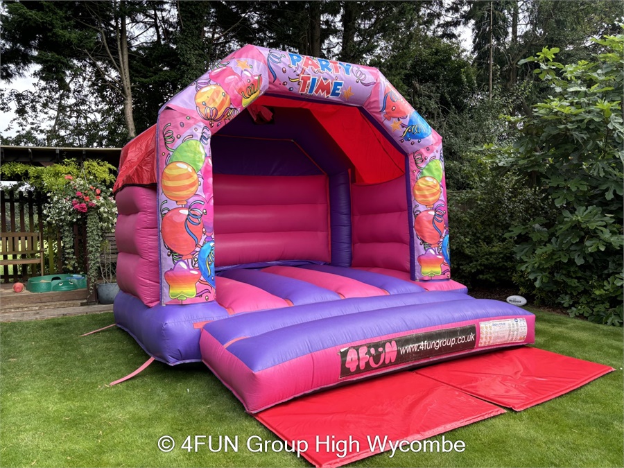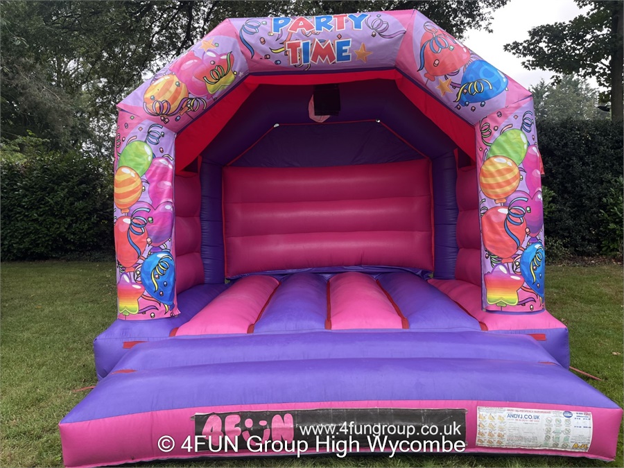 Party time Pink Purple Bouncy Castle for hire in Buckinghamshire, Berkshire, Middlesex and Oxfordshire.