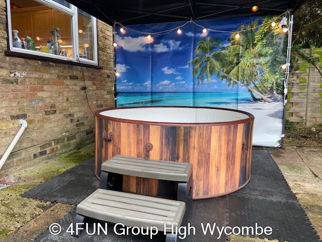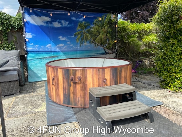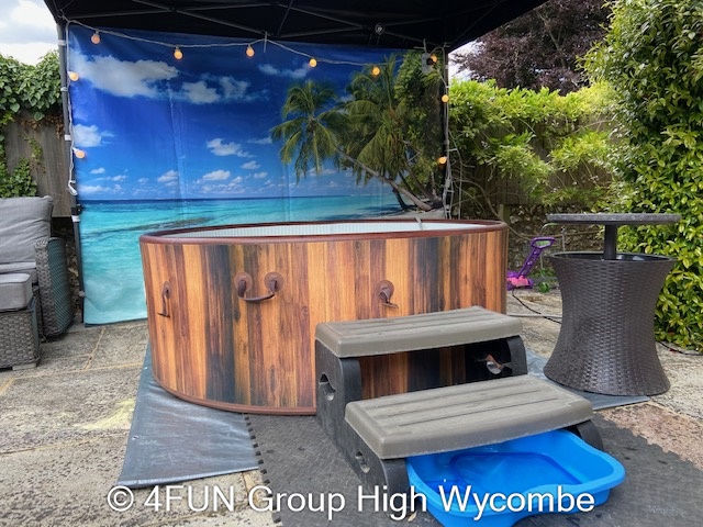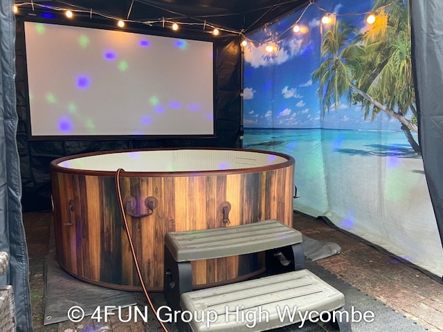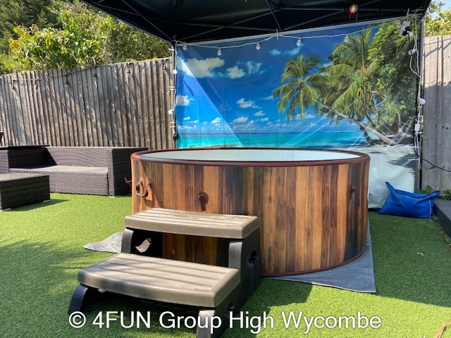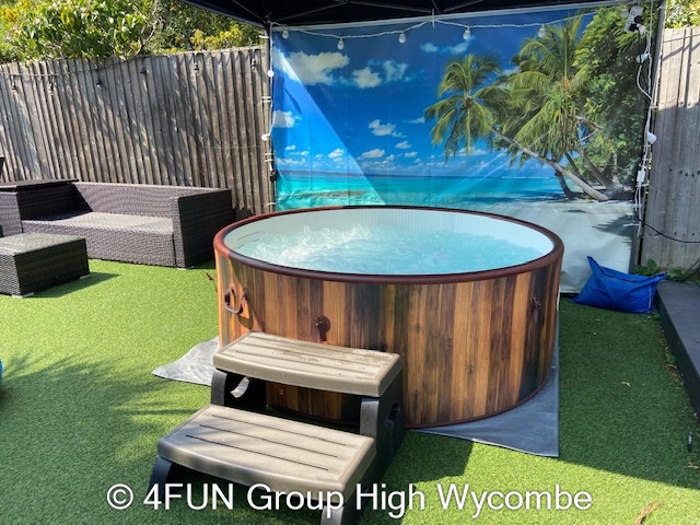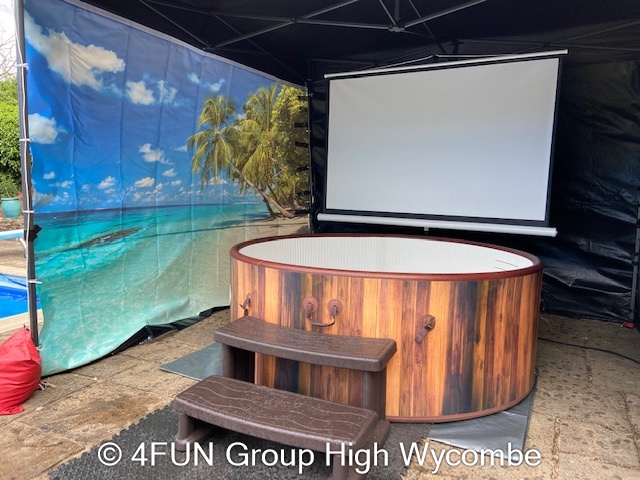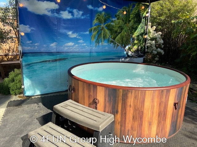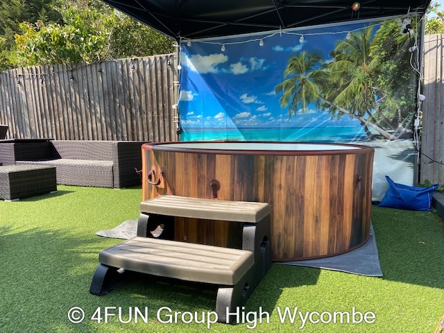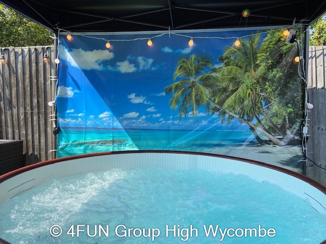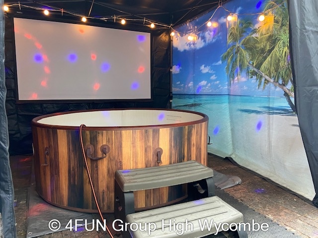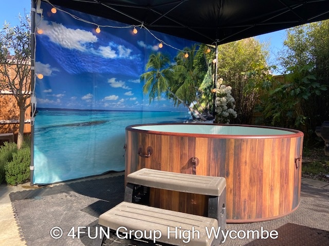 Tropical Beach Hot Tub and Gazebo Package for hire in Buckinghamshire, Berkshire, Middlesex, Oxfordshire.