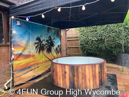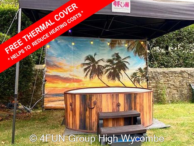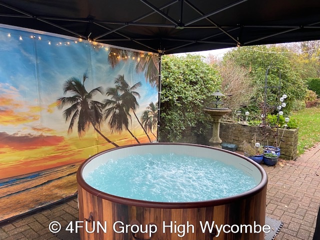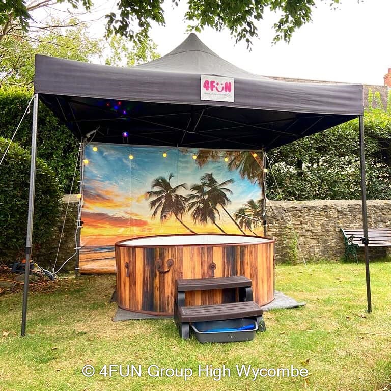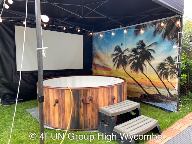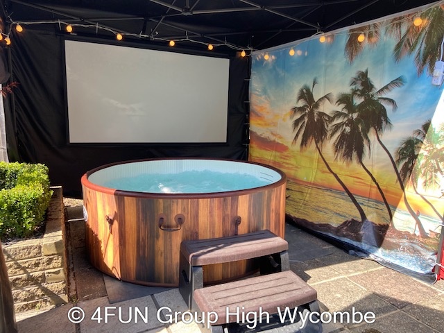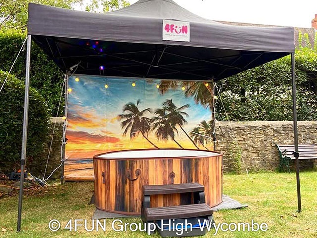 Tropical Beach Sunset Hot Tub and Gazebo Package for hire in Buckinghamshire, Berkshire, Middlesex, Oxfordshire.